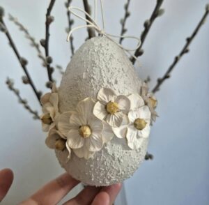 To jajko wielkanocne z kwiatami to kwintesencja wiosennej radości i elegancji. Zrobiłam je z myślą o osobach, które pragną wprowadzić do swoich wnętrz lekkość oraz romantyczny blask. Papierowe kwiatki sprawiają, że produkt stał się małym dziełem sztuki użytkowej, który idealnie wygląda w salonie czy holu obok lustra.