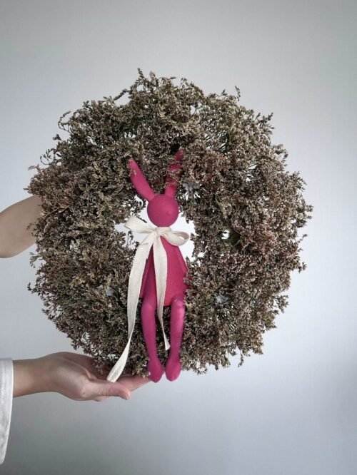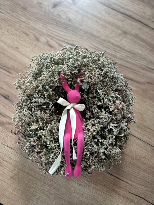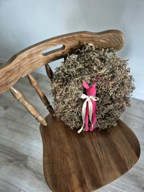 Materiał: suszony zatrwian, flokowany zając, baza ze słomy owinięta bawełnianym materiałem, bawełniana kokardka.